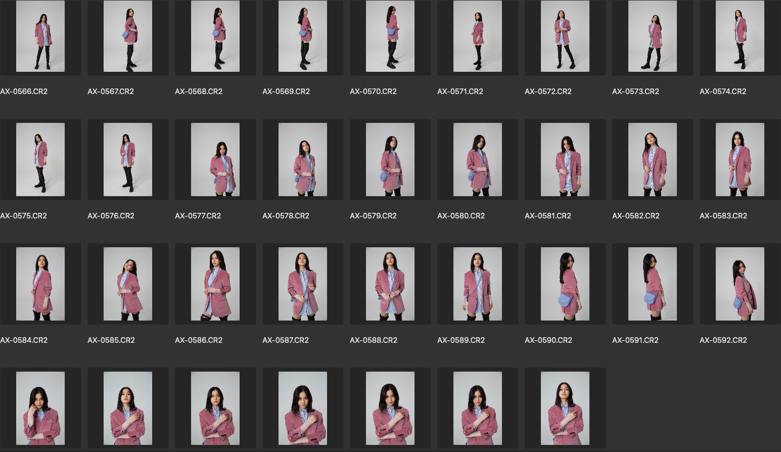 演员Angelababy(杨颖)早期棚拍生图素材,灰色背景,CR2格式。因为属于服装人像拍摄范围,所以拍摄主体还是以服装为主,人像为辅。截图内展示的为本组全部图片,图片具体细节可见最后一张截图。本资源来源于网络,仅供修图练习使用,请勿用于商业和其他不法用途。