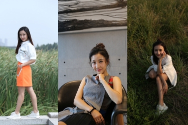 中国内地女演员张佳宁早期棚内拍摄未修调照片,格子短袖T恤配短裙