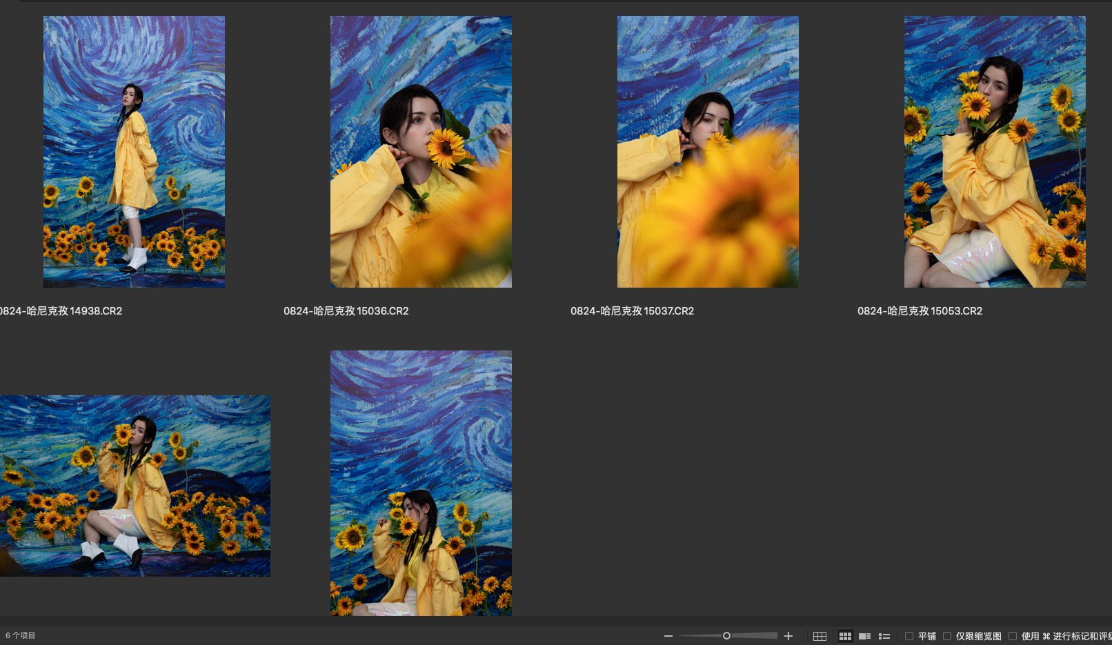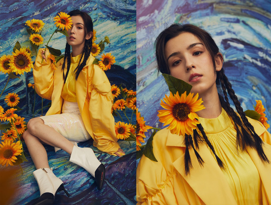 模仿梵高画作搭配的背景,黄色衣服和向日葵与蓝色背景形成了冷暖对比色。