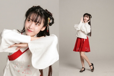 整体都是上半身构图,几张全身坐姿构图,丸子头配这套裙子很俏皮可爱。