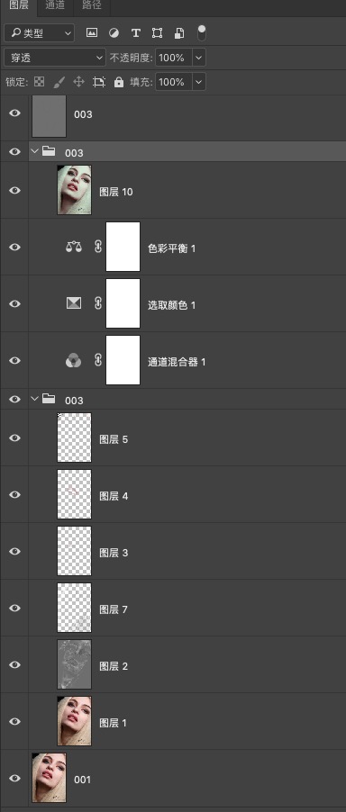 这是一张人像特写,所以后期相对于完整人像来说需要处理的地方少了很多,但同时要注意的细节却更多了。在处理这种特写的时候,主要就是将人物面部皮肤精修处理,然后五官轮廓也要注意细节刻画,精修面部皮肤的时候注意保留轮廓和结构感。通过操作流程的图层列表我们能够看到修图师利用的是中性灰来精细处理皮肤