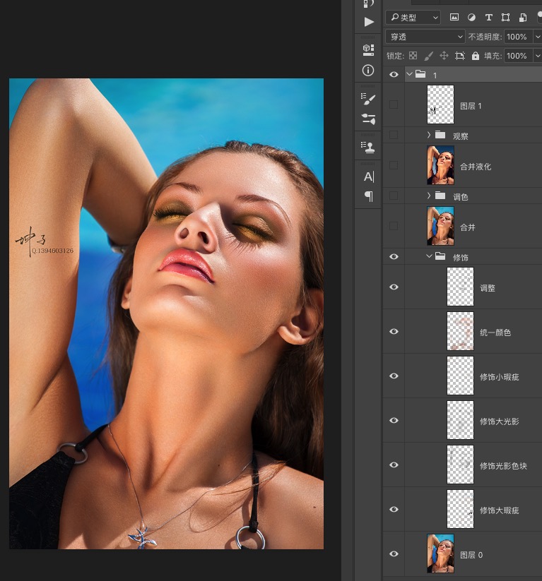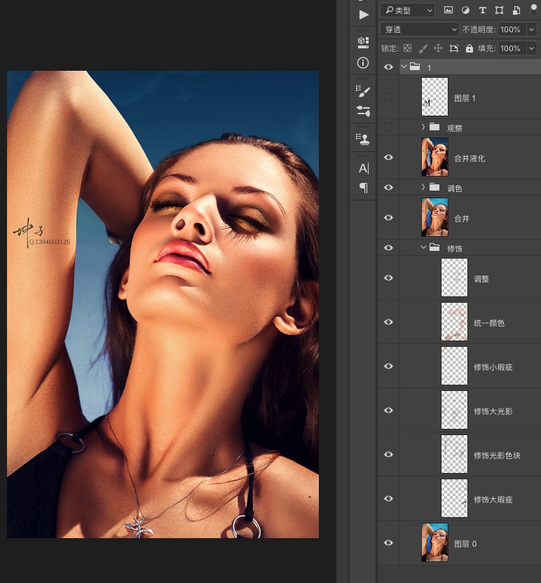 这是一张头颈部的特写照片,整个画面都比较饱满,留白的地方可以说极少了。在画面中我们可以观察到人物结构感是比较强的,尤其是原图,面部肌肉块是比较强烈的,所以我们后期处理的时候一定要把握好度,要尽量的消除掉比较杂乱的光影,并且弱化某些比较明显结构,还要保持整体画面的结构不会垮掉。通过图层列表可以看见这位修图师的操作步骤很是清晰明了,一看就是一位在修图界深耕很久的高手了。在这里对方采用的是柔光层精修法,也就是新建透明图层模式改为柔光,但并不填充中性灰。操作方法和中性灰大同小异。