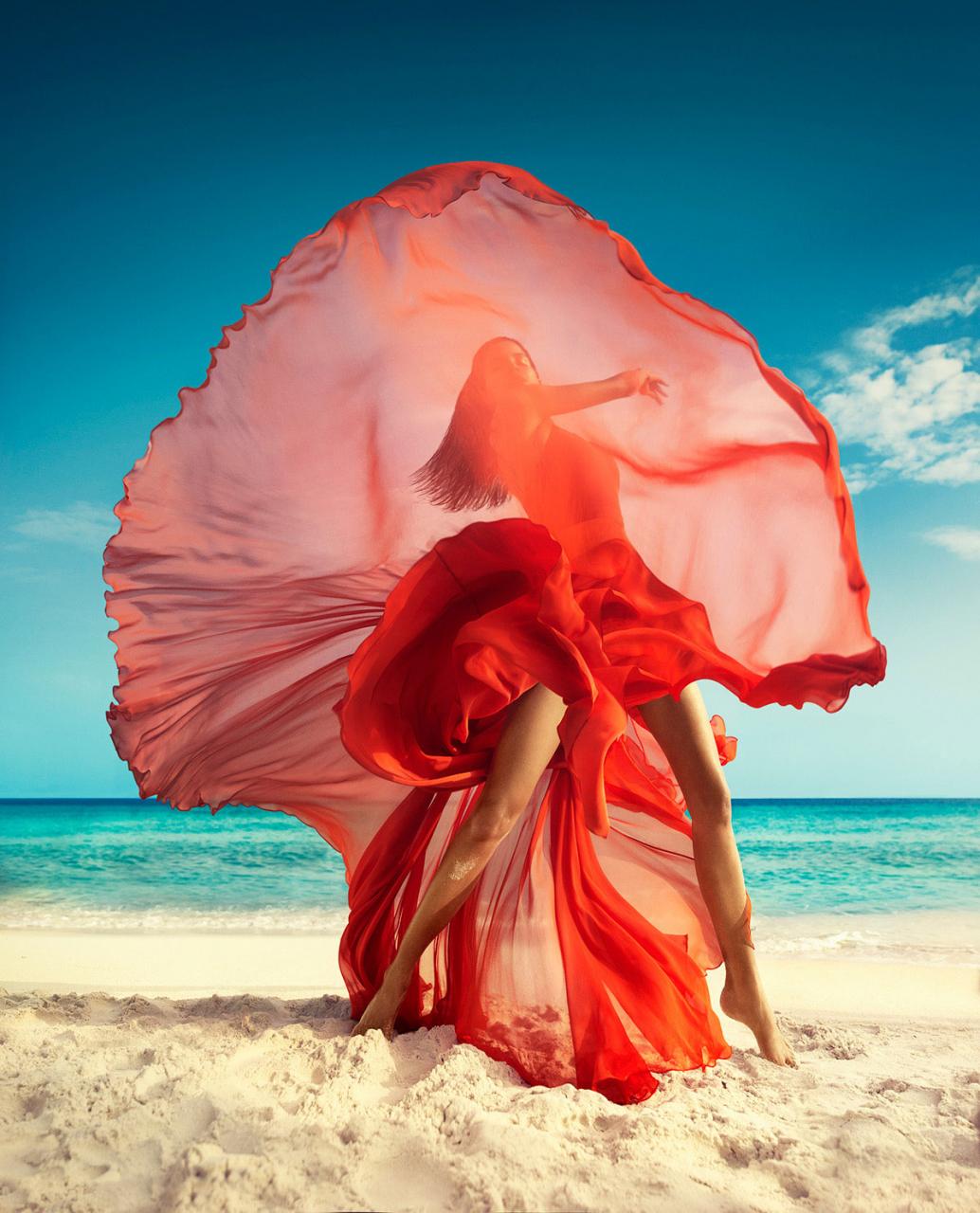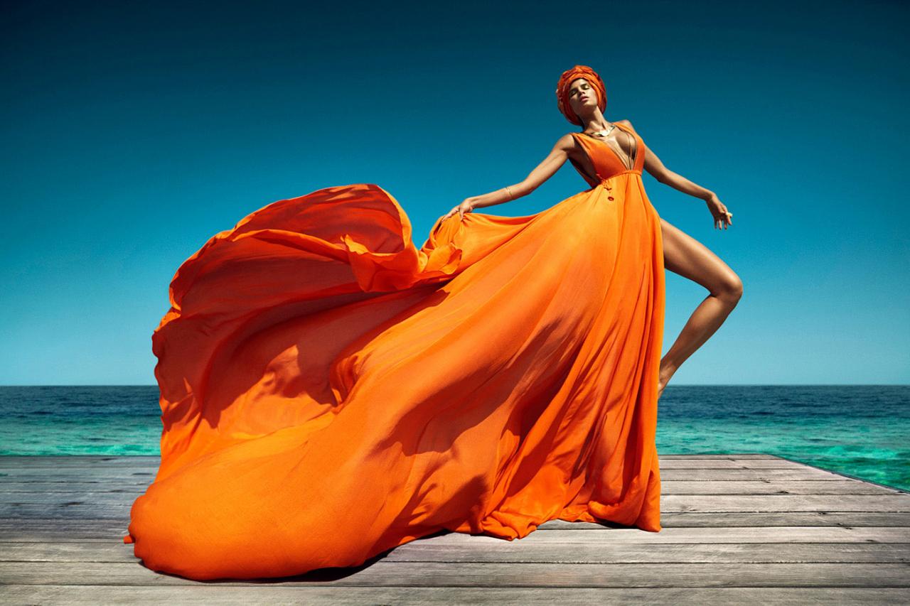 这个故事是由路易斯·蒙泰罗在马尔代夫为《Vogue》印度版拍摄的,讲述了强烈的色彩、形状和自然美。这张照片迷人的异国魅力是由深蓝色的天空和蓝绿色的海水与大胆的橙色形成和谐的对比,以及巴西模特Raica Oliveira古铜色的皮肤。在下面的英雄形象中,没有明显立足点的Raica被风吹起,风吹进她的裙子,与此同时,她又被木制的防波堤覆盖着。整体的艺术印象是永恒的空灵女神,唤起了古代的雕塑。修复过程从扭曲、扭曲和塑造整个场景开始,Raica的身高几乎是她的三分之一。接下来是增强和调整固有的颜色,最后是发展整体的情绪和品位。