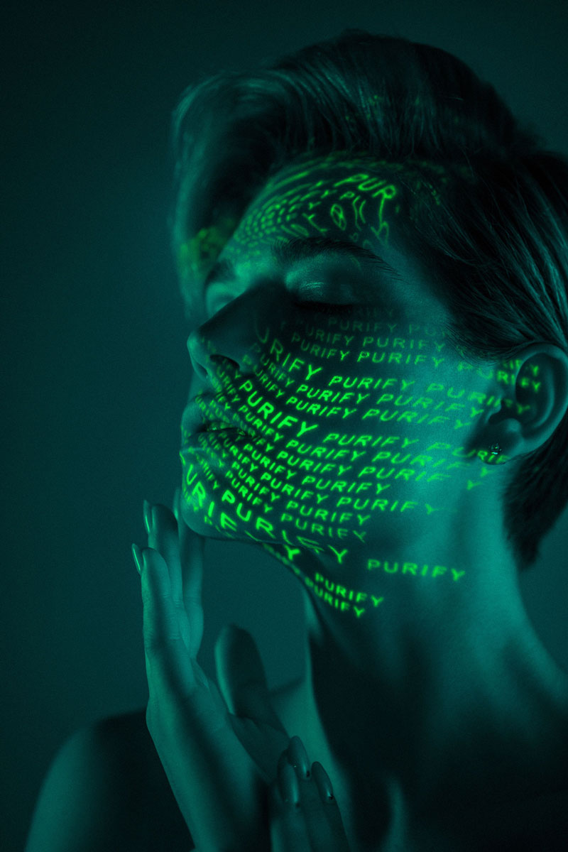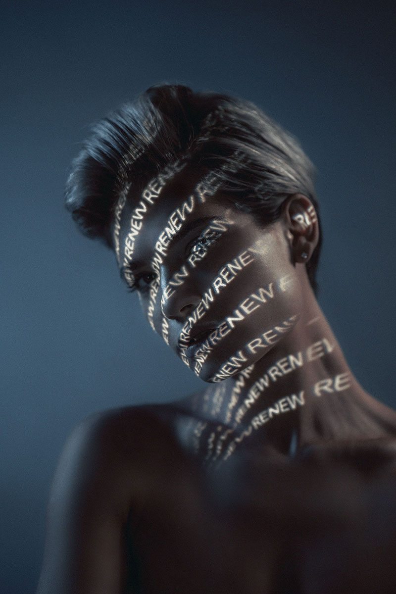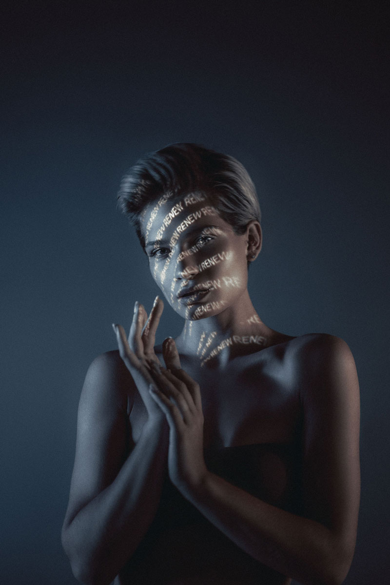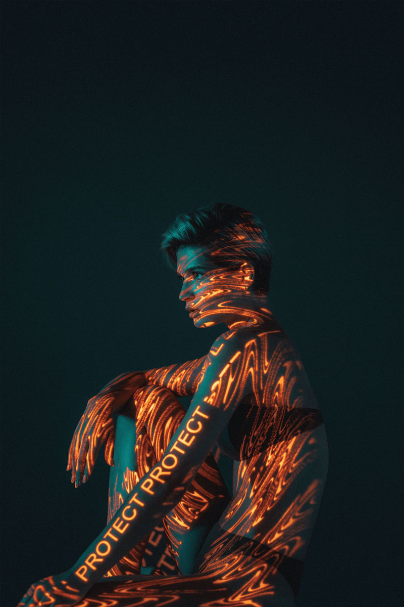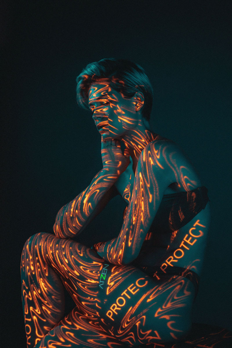 I was inspired by experiments with light, calligraphy, prismatic glass & long exposure. Our goal was to go away from direct / traditional advertising & to reflect the important relationship between technology and 5 ATZEN product lines: BALANCE™, PURIFY™, RENEW™, IN-SHAPE™, PROTECT™. The projector light includes a name of one of the 5 main products & characteristic color for that product in each case. Also, the light defines / highlight the area of cream application on the body. For example, the PROTECT™ product is a sun block line which are orange & used on face & body.