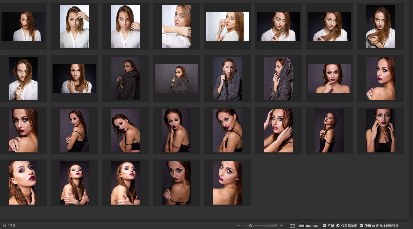 欧美女子棚内多组造型拍摄高清原片,CR2格式,分辨率正常,感光度正常。基本上都是特写镜头,主要考验后期皮肤精修和人物面部结构光影绘制的能力了。截图内展示的为本组全部图片,图片具体细节可见数据截图。本站资源存储在百度网盘或阿里云盘,下载请自行选择。由于电子资源具有可复制性,所以一经售出,概不退换,还请谨慎下单。本资源来源于网络,本站分享仅供修图练习使用,请勿用于商业和其他非法用途,侵权请联系删除。