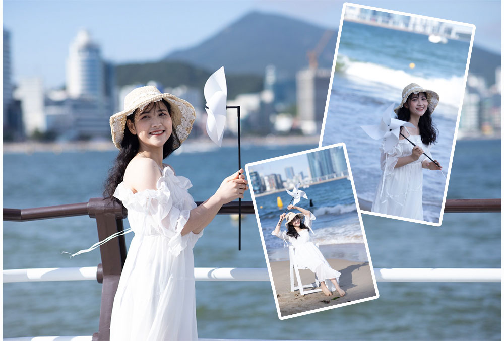 冷色调的海边白裙少女未修调照片。
