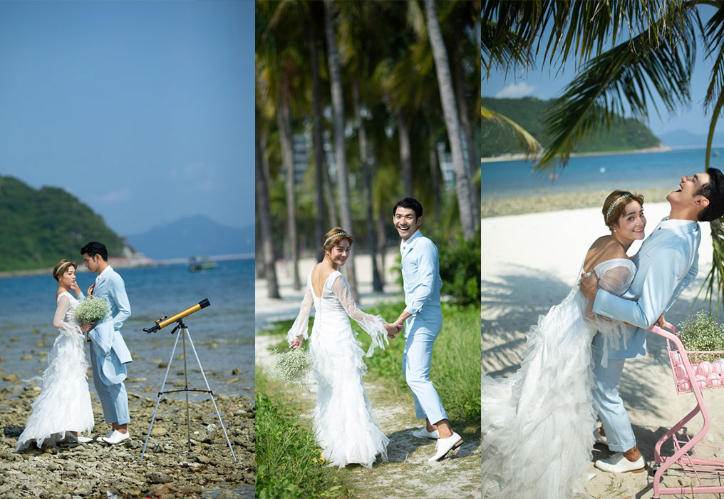国内经典婚纱照样片,椰子树的背景显得有点杂乱了。