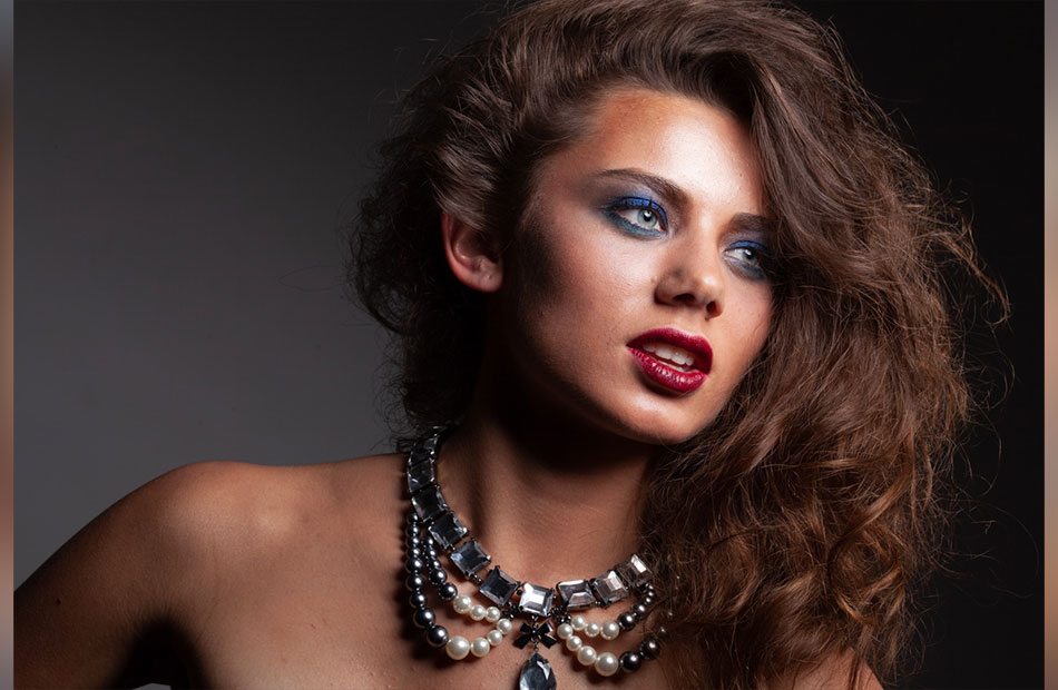蓝色眼妆的女模特棚拍特写,人像精修练习素材。