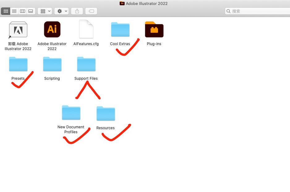 如下图所示,解压缩后获得✓所示的文件夹,里面便是对应的中文或者英文语言文件,直接替换掉对应名字的文件夹,其中Support Files文件夹中包含了两个文件夹。